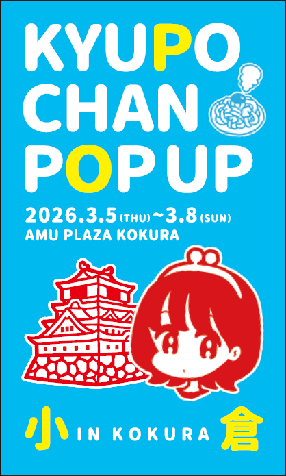 2026年3月5日(木)~3月8日(日)11:00~19:00、アミュプラザ小倉 ポップアップ北九州 -KOKURA BASE-(小倉駅3階 小倉城口 旧総合観光案内所)にて「キューポちゃんPOPUP」が開催されます。