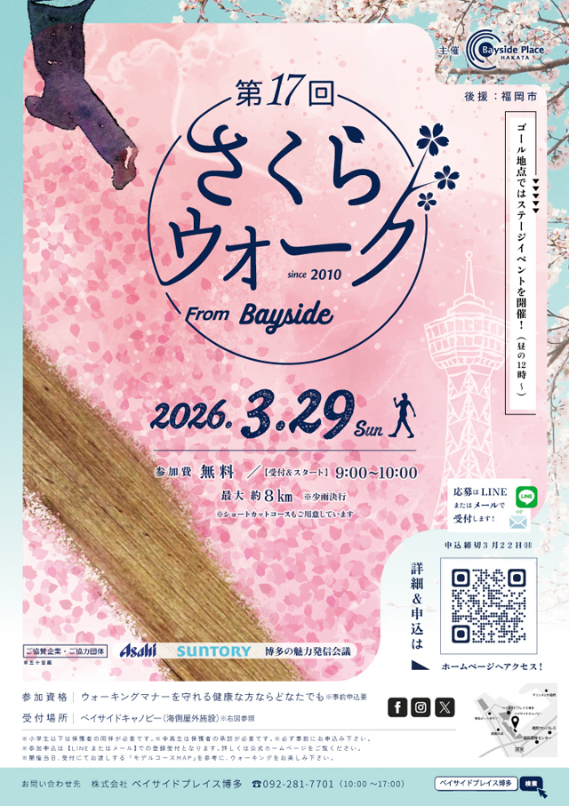 2026年3月29日(日)9:00~10:00(受付&出発)「第17回 さくらウォークfrom ベイサイド 」が開催されます。ベイサイドプレイス博多(福岡市博多区築港本町13番6号)にて受付・参加無料・小雨決行。