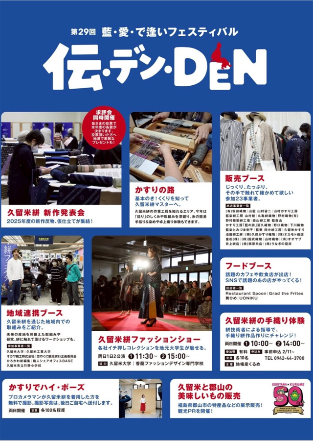2026年3月14日(土)~3月15日(日)10:00~17:00、地場産くるめ(久留米市東合川5-8-5)にて、年に一度の産地最大のお祭り「第29回藍・愛・で逢いフェスティバル『伝・デン・DEN ~脈々とつなげる~』」開催。入場無料。