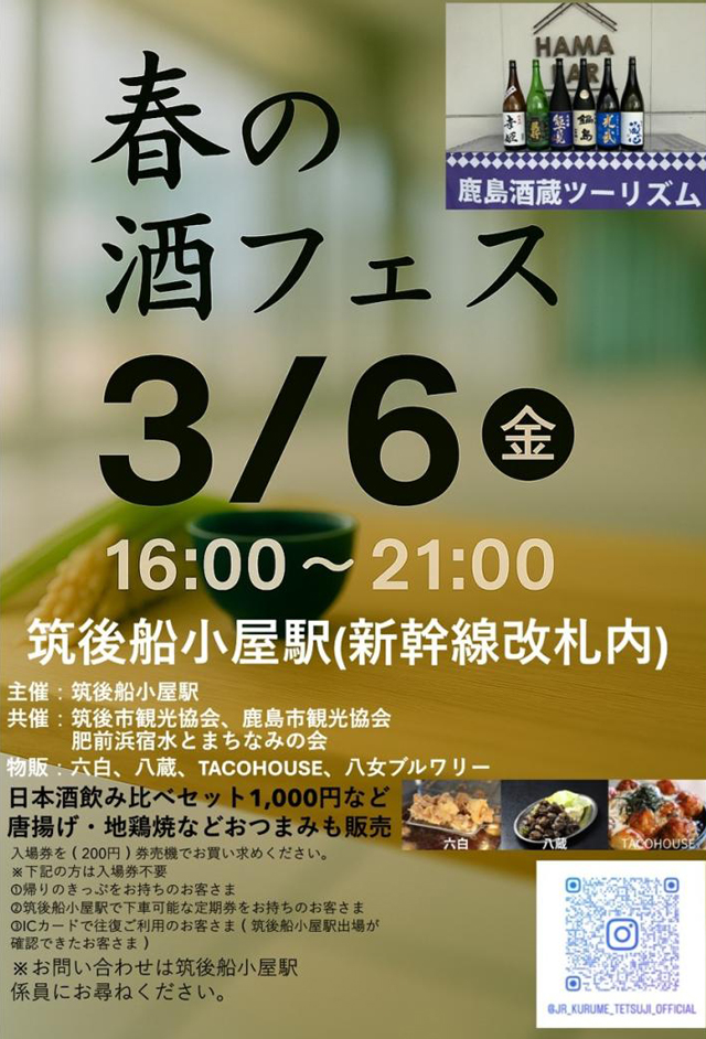 2026年3月6日(金)16:00~21:00、JR筑後船小屋駅の改札内で、鹿島酒蔵ツーリズム2026のプレイベント「春の酒フェス」が行われます。