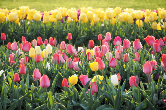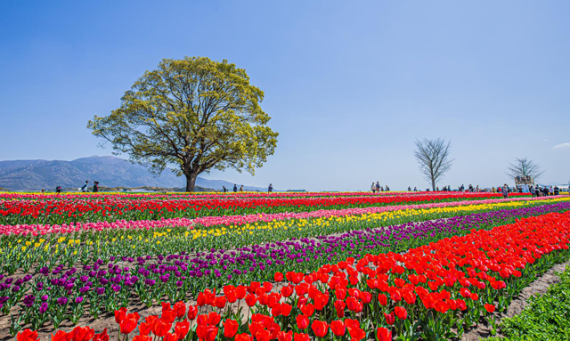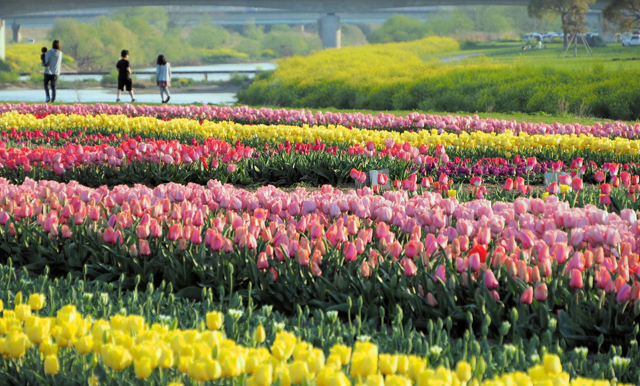赤・黄・ピンクなど色とりどりのチューリップが風に揺れる光景は優雅で、まさに癒やしの空間。タイミングが良ければ、満開の桜や菜の花とのレアなコラボレーションが見られるかもしれません。