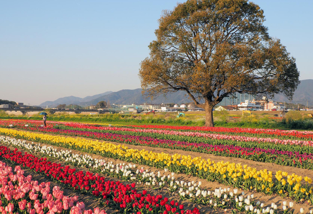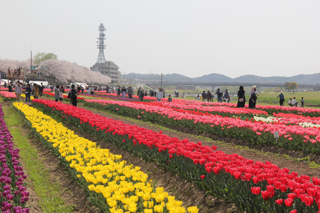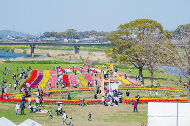 毎年3月下旬から4月上旬まで、遠賀川河川敷公園で開催される直方市の一大イベント。1,000人を超える市民ボランティアの協力で植えられた約20万球のチューリップとムスカリが、河川敷一帯に咲き誇ります。