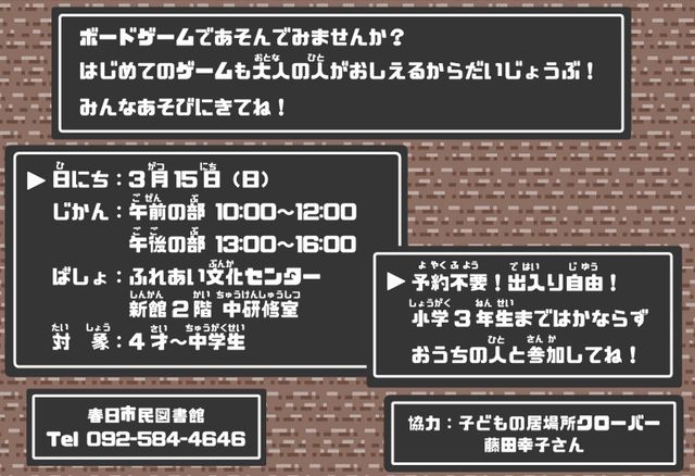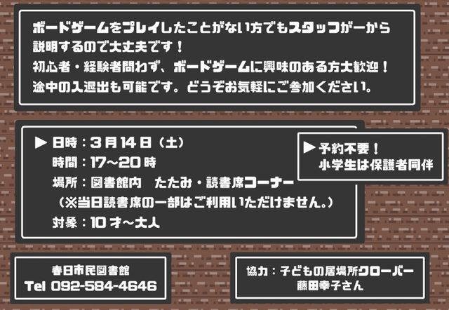 2026年3月14日(土)~3月15日(日)春日市民図書館/春日市ふれあい文化センター(春日市大谷6丁目24番地)にて『図書館deボードゲーム』が開催されます。予約不要・出入り自由。