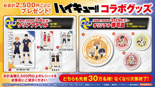2026年3月6日(金)~3月31日(火)アニメ「ハイキュー!!」×くら寿司コラボキャンペーンが開催されます。オリジナルカードが付いたコラボメニューの販売や、会計2,500円ごとに先着でコラボグッズがもらえます。