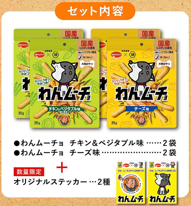 国産じゃがいもにこだわり、スナックの更なる進化・深化を追求し続ける湖池屋と、国産品質にこだわり、ペットとその家族の幸せの創出に取り組む日本ペットフードとの想いが共鳴し、愛犬用おやつ「わんムーチョ」が誕生しました。