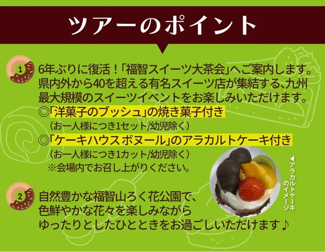 旅行代金に含まれるもの:JR券代、貸切バス代、スイーツ代、福智山ろく花公園入園料