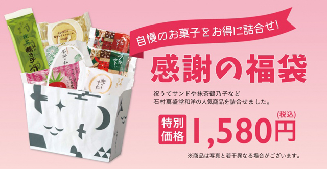石村萬盛堂人気の焼き菓子や、季節限定鶴乃子などの和洋菓子を詰め合わせた福袋。