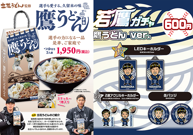 発売を記念して、HAWKS STORE HOMEにて人気の若鷹ガチャにも「鷹うどんver.」が登場。立花うどんこだわりの出汁とうどんを、おうちでも気軽に楽しめる3食分の半生うどん&つゆセット。