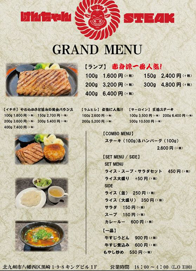 2026年3月9日(月)「けんちゃんステーキ 黒崎店」(北九州市八幡西区黒崎1-9-8 キングビル 1F)がオープン。営業時間は18:00~4:00(L.O. 03:00)。水曜日は定休日。