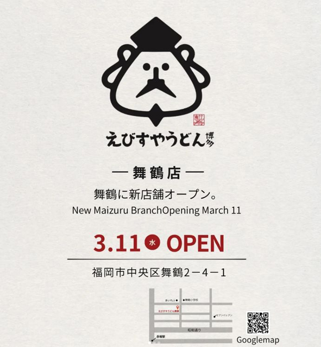 2026年3月11日(水)「えびすやうどん博多 舞鶴店」(福岡市中央区舞鶴2丁目4-1)がオープンします。住吉店に続き、舞鶴の地で新たな一歩を踏み出します。