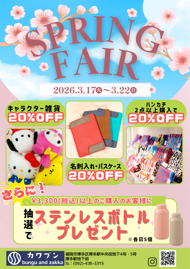 文具と雑貨のセレクトショップ 『カワブン』(博多駅中央街 地下4号・5号 博多駅地下街)は、2026年3月17日(火)~3月22日(日)の6日間限定で「スプリングフェア」を開催します!