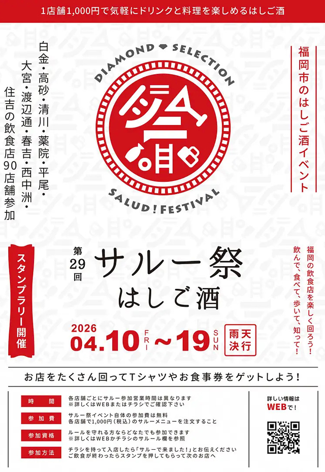 テーマは「飲んで、食べて、歩いて、知って!」。開催場所は、福岡市の白金・高砂・清川・薬院・平尾・大宮・渡辺通・春吉・西中洲・住吉の飲食店90店舗!サルーはスペイン語で乾杯の合図!みんなで楽しく盛り上がりましょう!みんなでサルー!