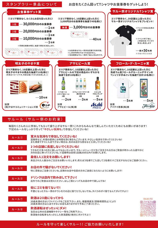 さらに!オリジナルスタンプラリーも同時開催!参加店舗をまわればまわるほど豪華賞品が当たるオリジナルスタンプラリーを開催!賞品はTシャツ/お食事券/明太子/お酒など多数用意。