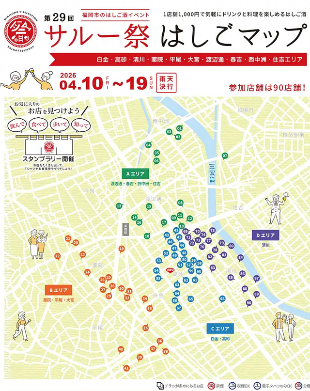 2026年4月10日(金)~4月19日(日)の10日間、福岡市の白金・高砂・清川・薬院・平尾・大宮・渡辺通・春吉・西中洲・住吉・那の川の飲食店90店舗にて「第29回 サルー祭」が開催されます。
