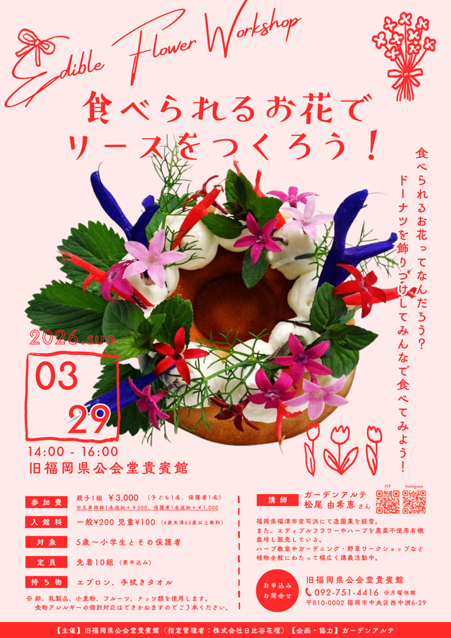2026年3月29日(日)に福岡市中央区西中洲にある重要文化財、旧福岡県公会堂貴賓館(福岡市中央区西中洲6番29号)にて、親子向けワークショップ「食べられるお花でリースをつくろう!」を開催します。