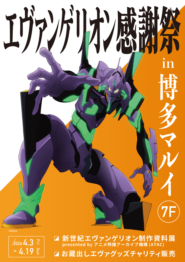 2026年4月3日(金)~4月19日(日)10:00~19:00、博多マルイ(福岡市博多区博多駅中央街9-1)7Fイベントスペースにて「エヴァンゲリオン感謝祭 in 博多」が開催されます。入場無料。