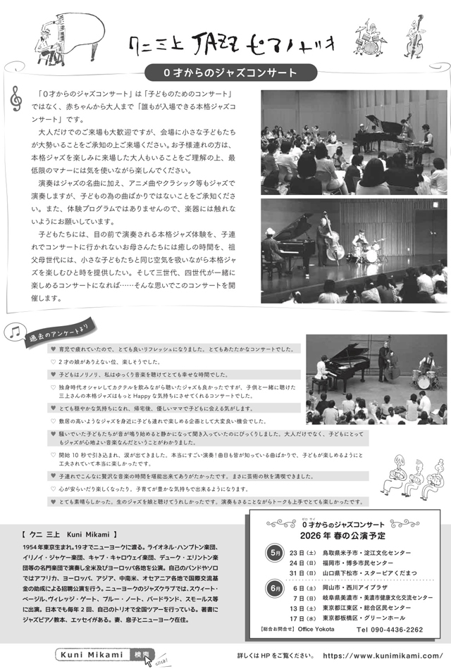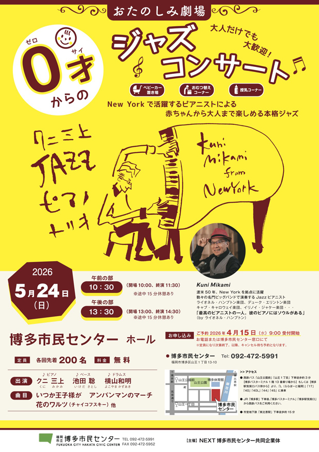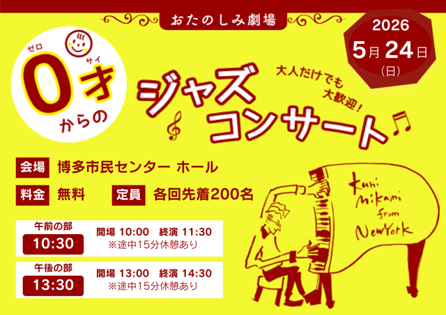 New Yorkで活躍するピアニスト・クニ三上による、赤ちゃんから大人まで楽しめる本格ジャズコンサートを無料で開催します!小さいお子さまから大人の方まで幅広い世代の方が楽しめる内容となっております。もちろん、大人だけの参加も大歓迎です!