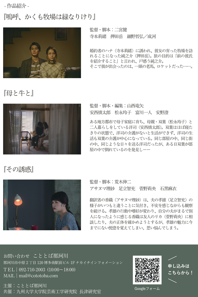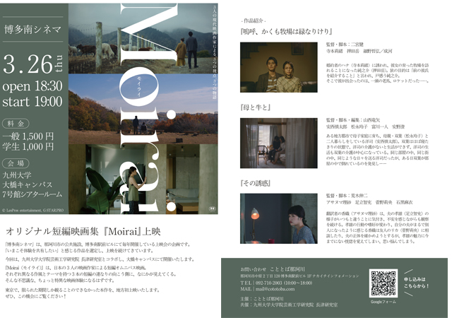 二宮健(『チワワちゃん』『真夜中乙女戦争』)、山西竜矢(『彼女未来』)、荒木伸二(『ペナルティループ』『人数の町』)、3人の現代映画作家による短編映画集『Moirai』を、九州大学大橋キャンパスにて1日限定上映!