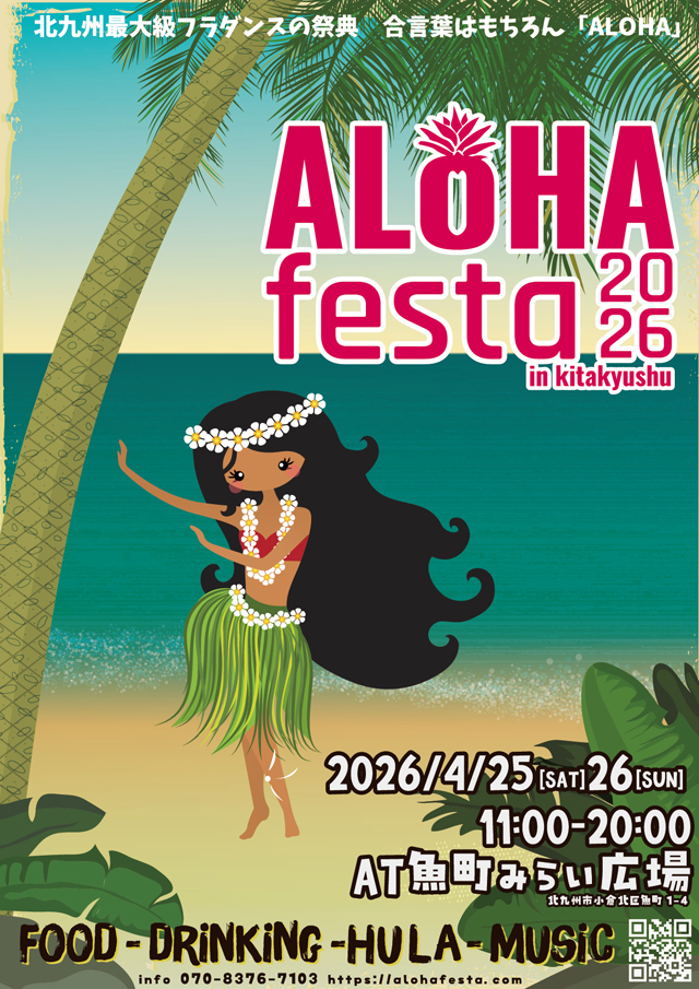 小倉の街中にハワイの風が吹き抜ける! 2026年4月25日(土)~4月26日(日)11:00~20:00、魚町みらい広場(北九州市小倉北区魚町1丁目4)にて、今年も「アロハフェスタ in 北九州」が開催されます。