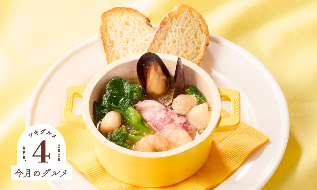 春が旬の菜の花と、ムール貝や海老、小柱、イカといったシーフードが入った具沢山なアヒージョです。バゲットを旨みたっぷりの具材と合わせたり、ガーリックの香りが食欲をそそるオイルソースに浸したりして召し上がりください。追加の一皿や、白ワインなどのお酒のお供にぴったりなメニューです。「追加バゲット60円(税込66円)」も用意しています。