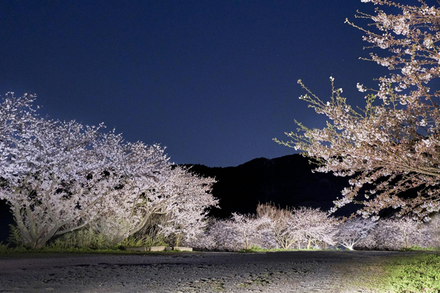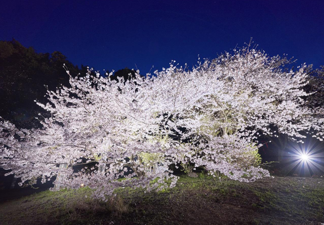 麓から続くさくら道は、両側から桜のトンネルで迎えてくれます。夜間には周辺の桜がライトアップされ、幻想的な風景を楽しめます。