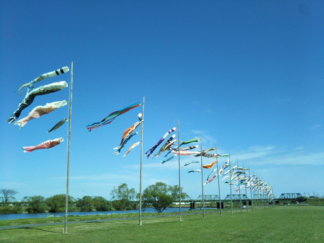 今年の開催期間は2026年4月4日(土)~5月8日(金)。広大な河川敷の芝生に寝転びながら、約150匹の鯉のぼりが悠々と泳ぐ姿をのんびり眺めることができます。※天候の状況により開催期間を変更する場合あり。