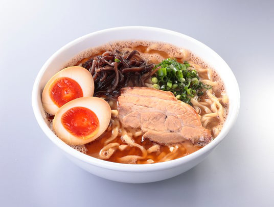 豚骨醤油スープに負けないように海老の味、風味を活かしたスープ( 甘エビやオキアミ使用)が自慢です。麺はモチモチ感を重視した中太ちぢれ、喉越しをお楽しみ下さい。