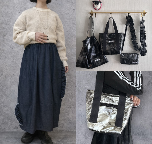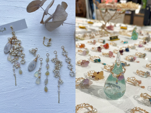 水晶やガラスにアクリルなど様々なマテリアルを使って製作しています。他にも身につけやすい個性的なイヤカフやこれからの季節大活躍のお洋服をご準備します。