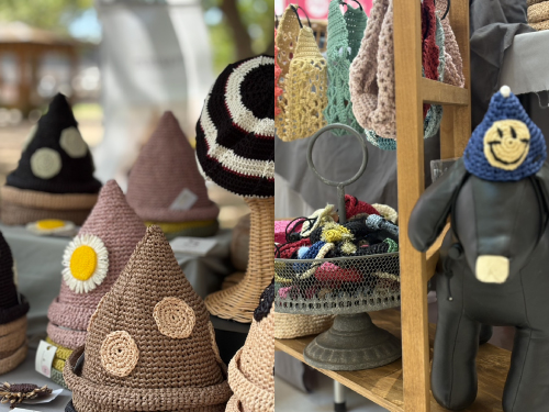 これからの季節にピッタリのとんがり麦らわ帽子をかぎ針編みで制作しています。赤ちゃんから大人まで 老若男女問わず、かわいくとんがりませんか?他にも、ヘアーバンドやポシェット等 編み物小物も用意します。