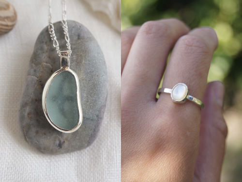 海で集めたシーグラスや貝殻のアクセサリー。自然が生み出した素材の色や形を生かし、ひとつひとつ丁寧に作っています。