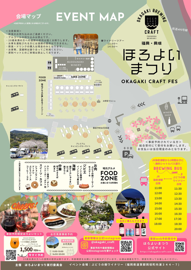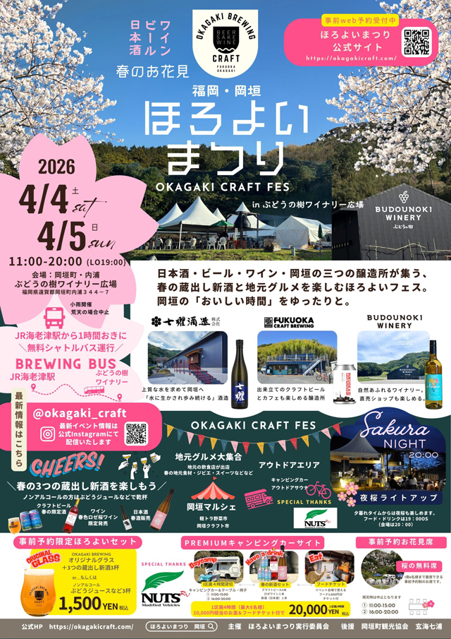 2026年4月4日(土)~4月5日(日)11:00~20:00(LO19:00)、ぶどうの樹ワイナリー広場(遠賀郡岡垣町内浦344-7)にて、新酒とグルメを味わいながらお花見ができるイベント「ほろよいまつり2026 in ぶどうの樹ワイナリー」が開催されます。