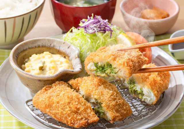 バジルソースとチーズが引き立つ、味わい豊かなアジフライ。ふっくらとしたアジに、バジルの香りとチーズのコクを効かせて揚げた洋風仕立ての一品で 。タルタルとソースの2種で、味わいの変化も楽しめます。