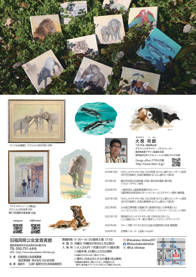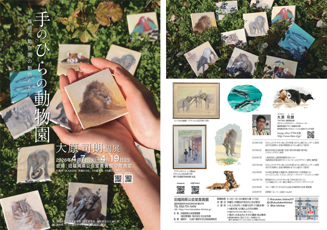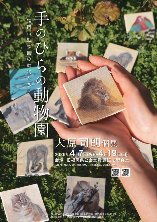 2026年4月7日(火)~4月19日(日)9:00~18:00(最終入館17:50)福岡市中央区西中洲にある重要文化財、旧福岡県公会堂貴賓館(福岡市中央区西中洲6番29号)にて、「手のひらの動物園」~福岡市動物園の動物たち~ 大原司朗個展 を開催します。