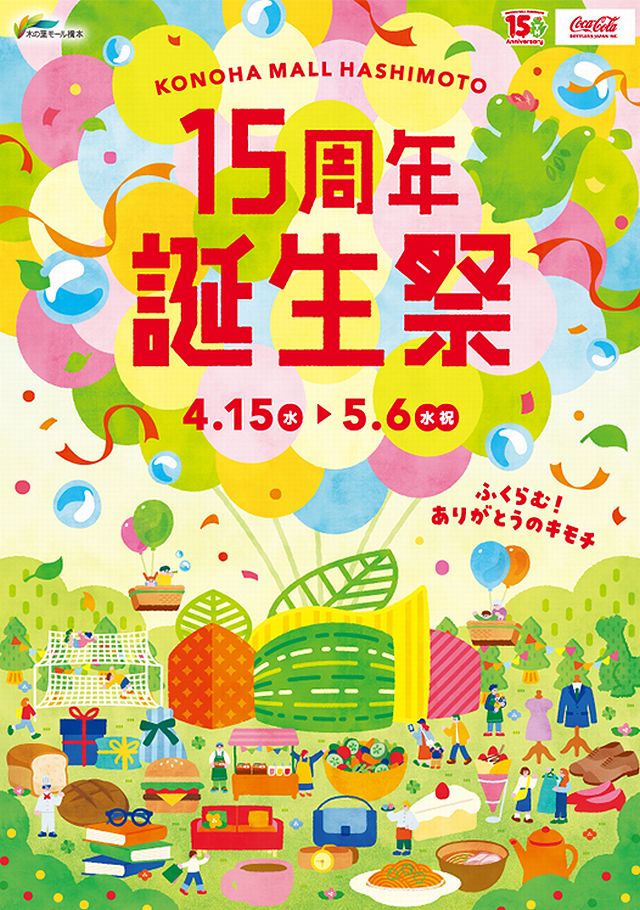木の葉モール橋本(福岡市西区橋本2-27-2)は、2026年4月15日(水)に開業15周年を迎えます。15周年の感謝を込めて、2026年4月15日(水)から5月6日(水・休)までの期間「15周年誕生祭」を開催。