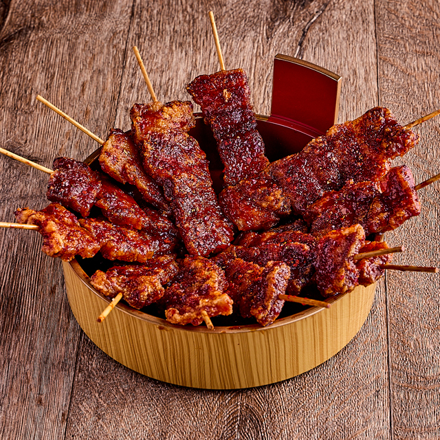 絶対に食べてほしい無二無三のオリジナル串メニュー。独自の調理法に秘伝のスパイスやタレを加えた白,赤.黒と3種を用意。お口の中でジューシーな旨味が存分に広がり何本でも食べたくなってしまう中毒性抜群の魅惑の味わいが実現。