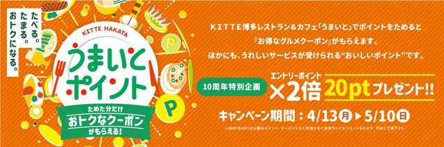 KITTE博多の LINE 公式アカウントを友だち追加のうえ会員登録いただくと、対象の飲食店舗のご利用でポイントがたまる新サービス「うまいとポイント」がスタートします。たまったポイントに応じてランクがアップし、ランクアップごとにレストラン&カフェ「うまいと」(B1・9F・10F)で使用できる「グルメクーポン」をプレゼント。さらに、開業10周年期間中に会員登録いただいた方には、エントリーポイントとして 20 ポイントを進呈し