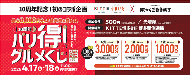 また、隣接するJRJP 博多ビル内「駅から三百歩横丁」との初の合同企画として、最大3,000 円分の食事券が当たる『10周年バリ得!グルメくじ』も開催。このほかにも、10 周年ならではの、感謝の気持ちを込めた多数のイベントを実施します。