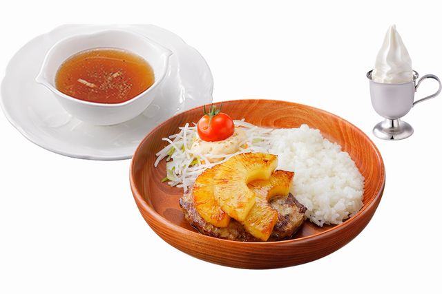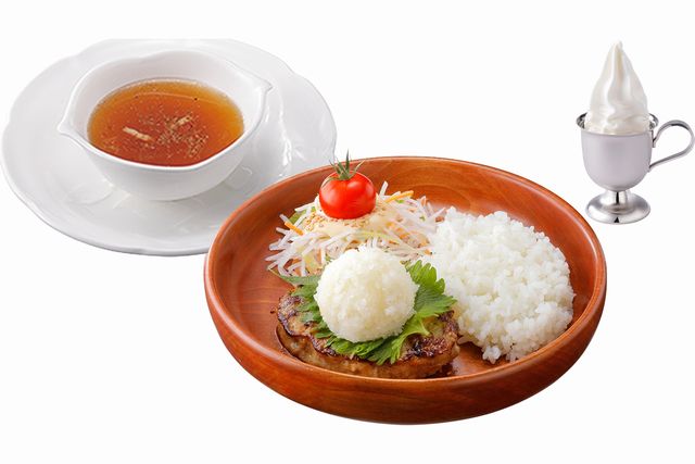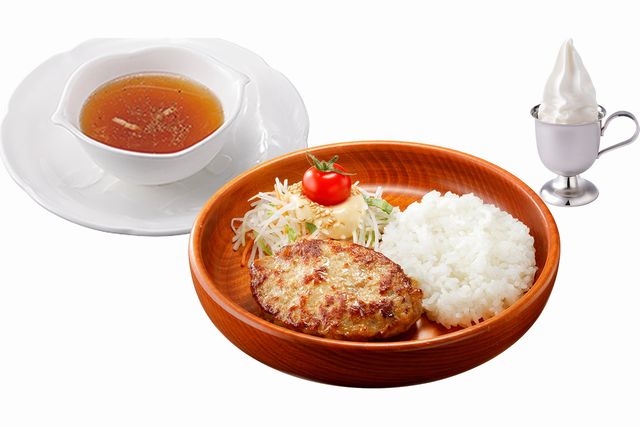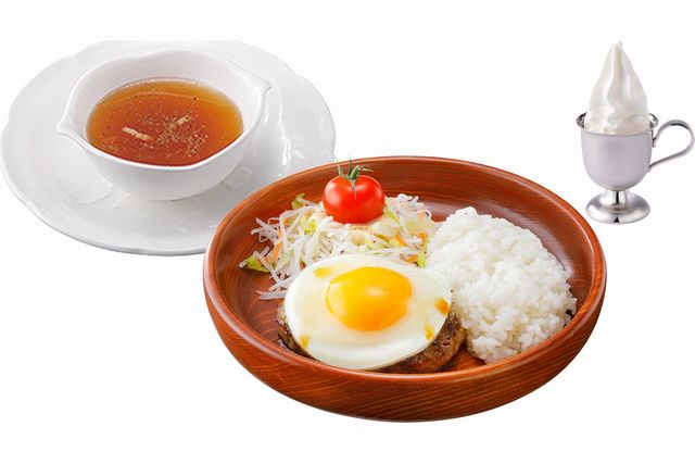 小さいハンバーグと少な目のライス、サラダでハンバーグディッシュを気軽に楽しめます。スープ(ビーフコンソメスープまたはみそ汁)と北海道ミニソフトも付いたセットです。北海道ミニソフトはお好みでドリンクに変更可能です。