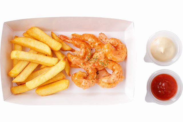 オリジナルのオーロラソースで和えたシュリンプとフライドポテトです。定番のトマトソースとオリジナルマヨネーズタイプもお好みで。