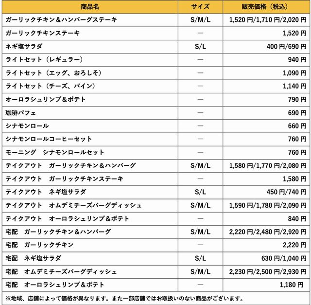 グランドメニューには、「ライトセット」「ガーリックチキン&ハンバーグステーキ」「ガーリックチキンステーキ」をはじめ、「ネギ塩サラダ」や「珈琲パフェ」など8品が定番商品に新たに加わります。