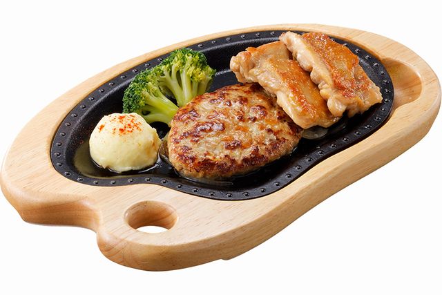 香ばしく焼き上げたガーリック風味のチキンステーキにハンバーグを盛り合わせました。※お肉は食べやすい大きさに切り、よく噛んで召し上がりください。