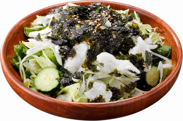 きゅうりやビタミン大根、わかめと長ネギを合わせ、食感を感じるえびせんと韓国のりを添えました。香り豊かなネギ塩だれで、やさしく絡めたサラダです。
