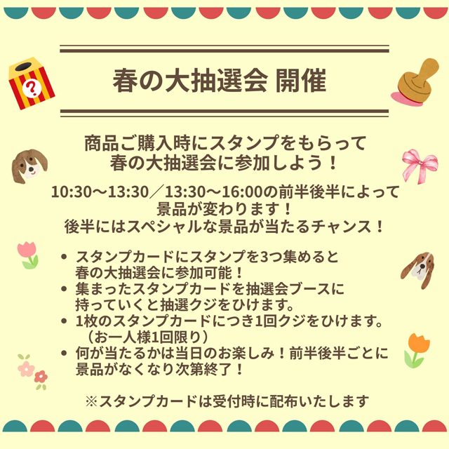 春の大抽選会開催!スタンプカードにスタンプを3つ集めると抽選会に参加可能。