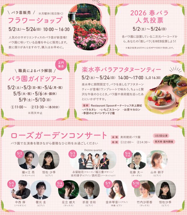 期間中は、園内で咲く品種を中心としたバラ苗の販売のほか、優雅な音楽に包まれるコンサート、バラをテーマにしたアフタヌーンティー、ワークショップ、謎解きゲームなど多彩なイベントを開催。