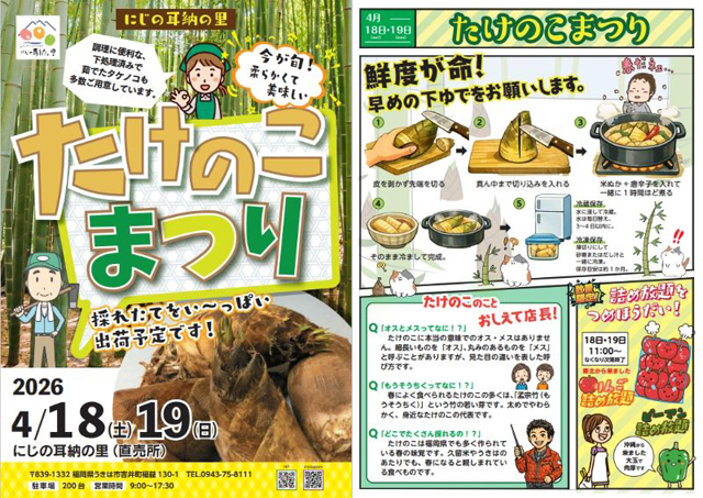 2026年4月18日(土)~4月19日(日)にじの耳納の里(うきは市吉井町福益130-1)にて春の大イベント「たけのこ祭り」が開催されます。